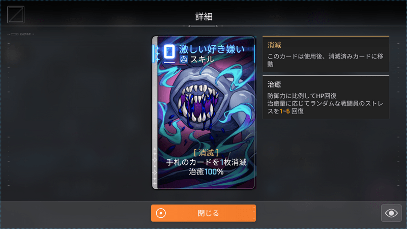 ![]() グレード2: 希少 | 1 | 激しい好き嫌い [消滅] 手札のカードを1枚消滅 治療100% ある意味モンスターカードだが、20記憶ptであると思われる。 | 全 |