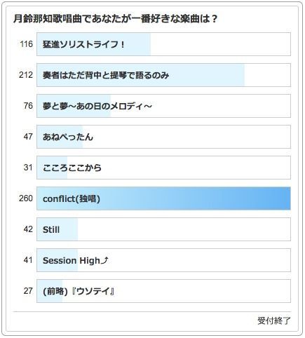 | 第29回 譜面ボーイズ総選挙第二週目 | 第30回 月鈴 那知歌唱曲人気投票 |