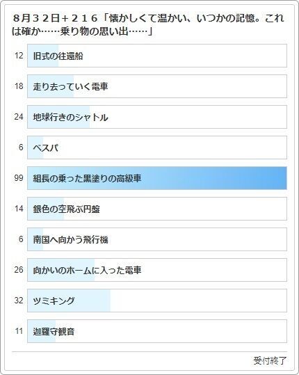 ![]() | ![]() 出典:旧式の往還船 / 走り去っていく電車 / 地球行きのシャトル / ベスパ / 組長の乗った黒塗りの高級車 / 銀色の空飛ぶ円盤 / 南国へ向かう飛行機 / 向かいのホームに入った電車 / ツミキング / 迦羅守観音 |