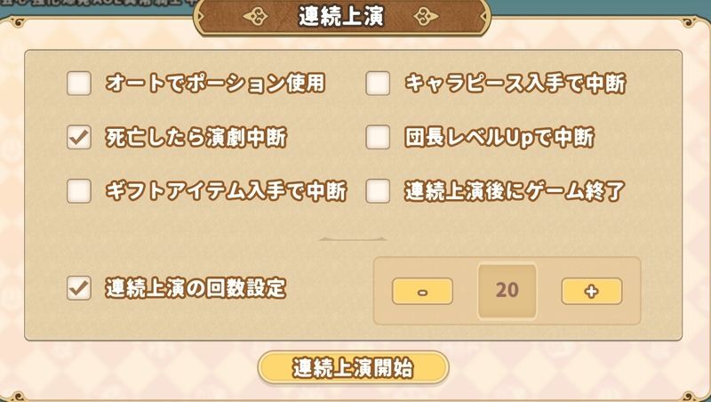 オート周回することも可能です。編成画面の右上にある連続上演を選択しましょう。