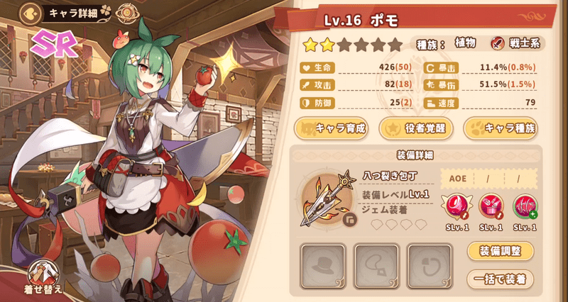 キャラはそれぞれ固有の武器を持っており、他に「髪飾り」「ネックレス」「リング」の3つの装備品を装着することができます。