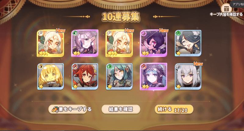 選考では最大20回10連ガチャを引き直すことができます。気に入った結果は「キープ」しながら引き直すことも可能です。キープは3回(+最後の1回)できますが2回目以降石(にんじん)を使うので気をつけましょう。気に入った結果を確定することでその10連結果を獲得することができます。