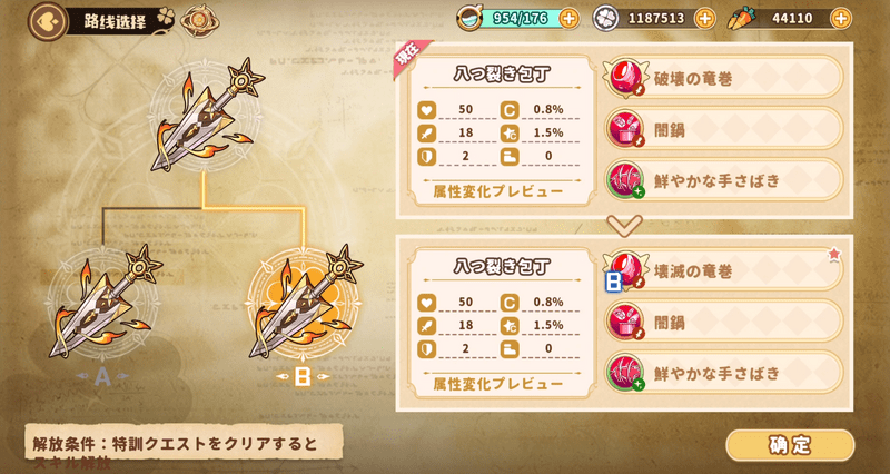 装備にはAルートとBルートがあり、ルートによって異なるスキルが使用できます。特訓(覚醒)で3段階目までパワーアップすることでAルートBルートを選択することが可能になります。