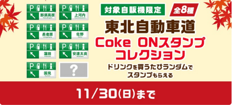 東北自動車道浦和IC~築館IC間のSA・PAに設置されているキャンペーン告知ポスターが掲示された自販機(56台)でドリンクを購入するとランダムで獲得できる(被りあり全8種)