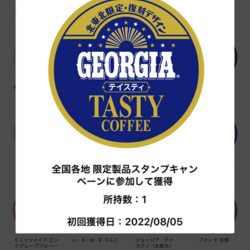 ジョージア テイスティ(北東北)スタンプは、「全国各地 限定製品スタンプキャンペーン(第二弾:2020年10月12日〜11月15日、第四弾:2022年7月11日〜8月14日、第五弾:2022年12月19日〜2023年1月31日、第六弾:12月15日〜2024年1月15日)」期間中にジョージア テイスティ(北東北)を購入することで獲得できた。