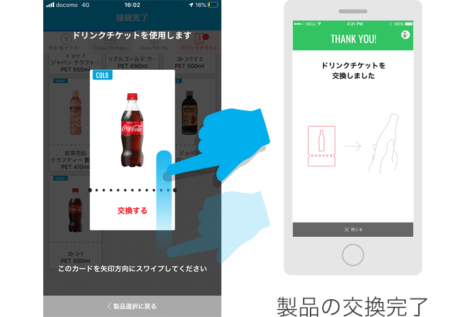 ポップアップで表示された製品を自販機に向けてスワイプすることで、ドリンクが出てくる。