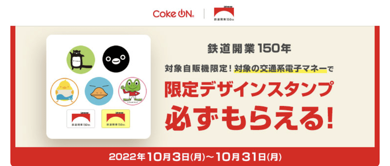 『Coke ON/コークオン』のスペシャルスタンプ「鉄道開業150年 kitacaデザイン」スタンプの解説記事です。入手方法や詳しい情報などを掲載しています。