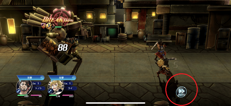 上の画像の赤丸の部分を2回タップすることで戦闘をオートで進めることが出来ます。