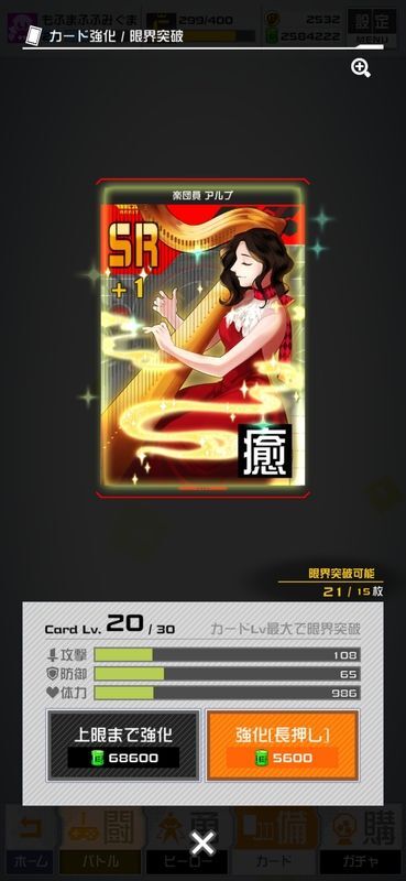 | Lv20/攻:108/防:36/体:897 Lv30/攻:135/防:45/体:1,123 Lv40/攻:162/防:54/体:1,350 Lv50/攻:189/防:62/体:1,576 Lv60/攻:216/防:72/体:1,802 |