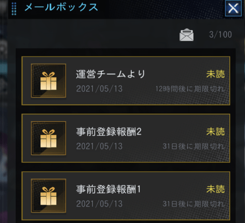 メールボックスから事前登録報酬を受け取ることで、20連のガチャチケットが受け取れます