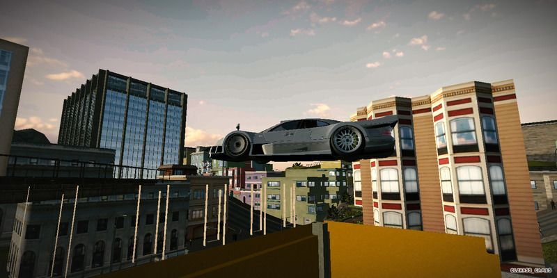 City1の高架の道路の横のビルに侵入して、ビルのベランダ?のような部分を走って右へ曲がり、左斜め前方のベージュのビルへ飛びます。