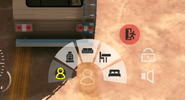内装の作りこみはとても高く、降車ボタンを押すと専用のラジアルメニューで車内の座席を移動できる。(アニメーションも作りこまれている)