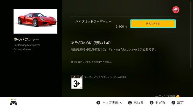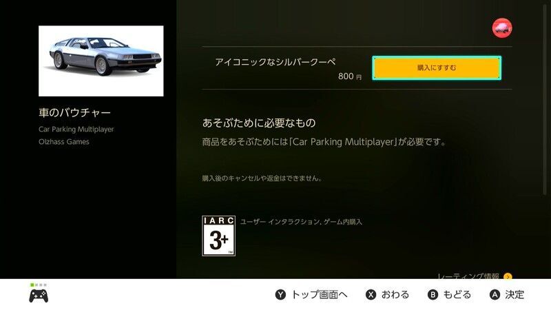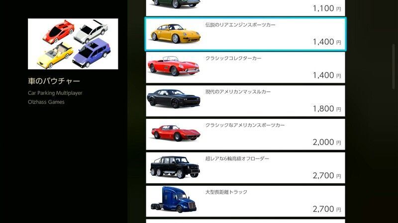 ver.1.3.65のアップデートで「車のバウチャー」という新商品が発売された。こちらは課金専用の車両をe-shopで直接買う形式で、スマホ版カーパーキングの直接課金車に相当する。本記事では販売されている車の値段や車名を紹介していく。