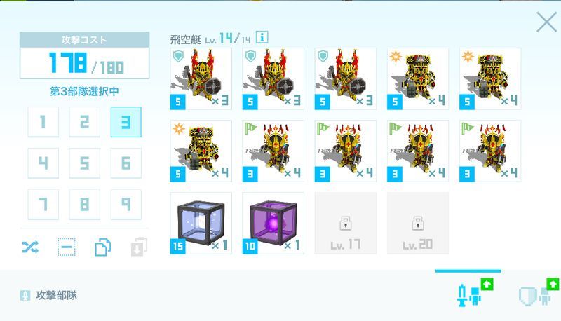攻撃側はあらかじめいくつかの編成を設定し、攻撃前に相手に合わせてそのスロットを選ぶことができます。