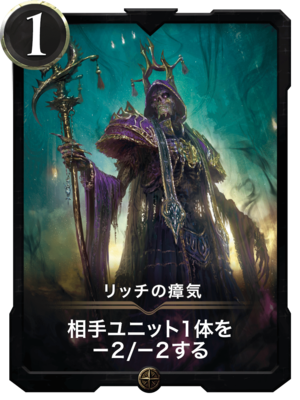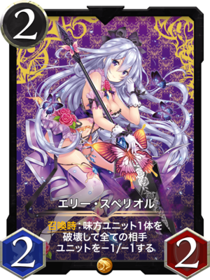 召喚時:味方ユニット1体を破壊して全ての相手ユニットをー1/ー1する |