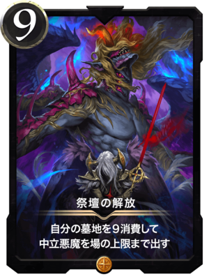 「祭壇の開放」を使用した次ターンに9コストCSの「リッチの魔眼」を使用することで場の悪魔全てを5/5にするコンボも選択肢に入ります。