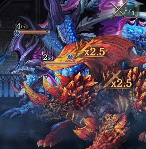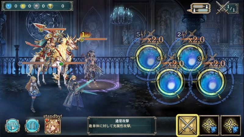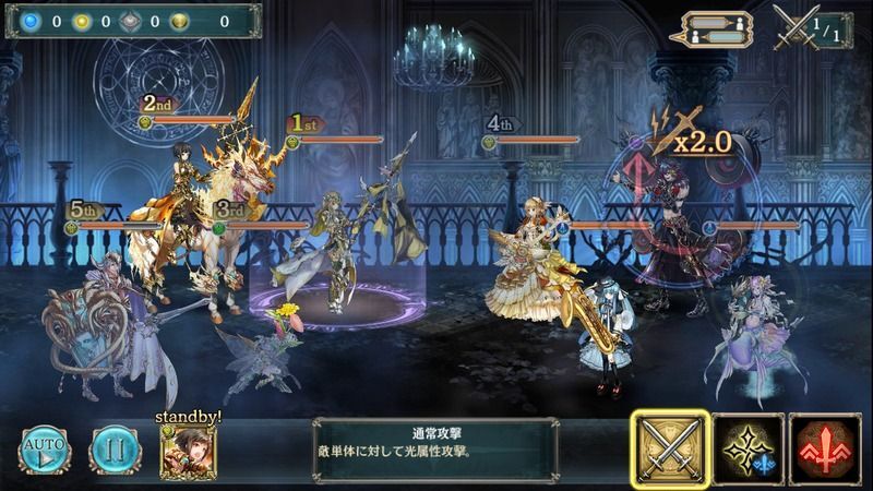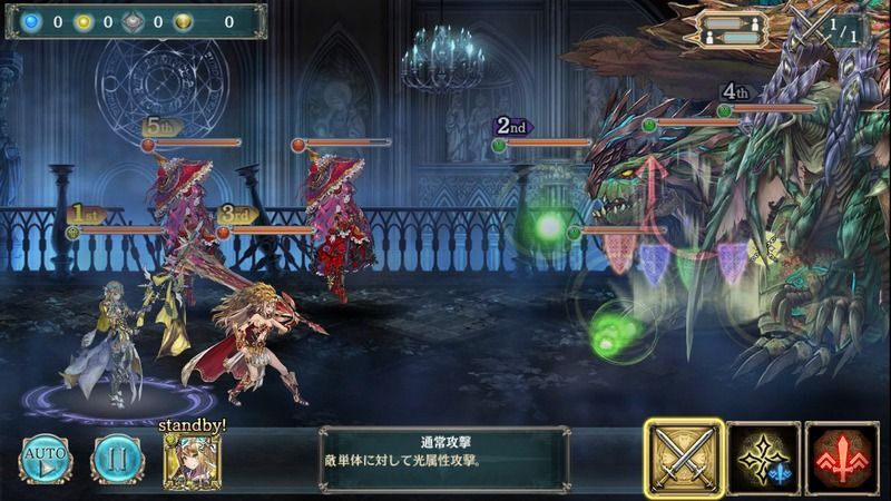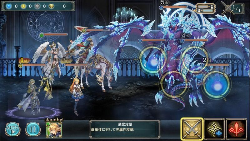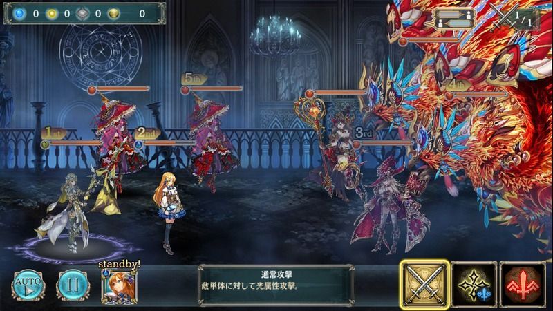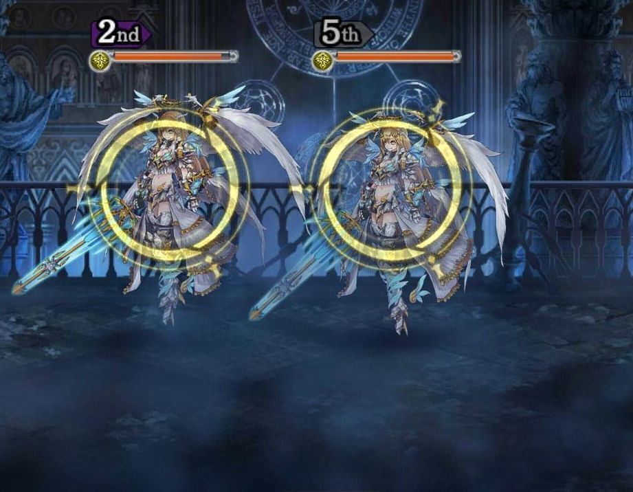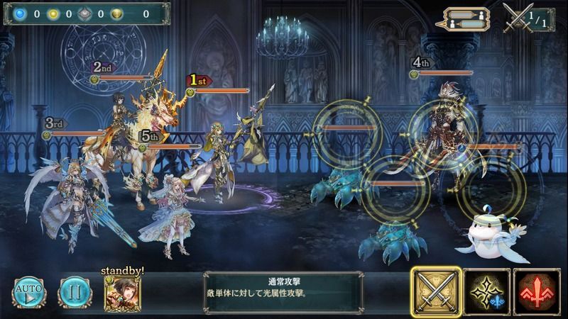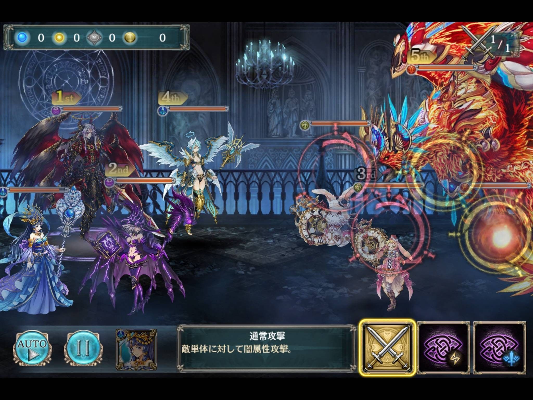 | 難所です!ユグドラシルに攻撃力ダウンのデバフを使われるとまず勝てない。フランシールのCT短縮も強力で厄介。まずはバフで強化しグリモア姉妹とユグドラシルを先に倒しましょう。 もしパラディンキラー持ちを連れて来ていたらそのキャラはリズを狙う。基本的にリズ以外にキラーが刺さるメリッサで固め、、残り一体は【天照姫神】アマテラスかユニコーンかサヴェジガストがオススメ。 フレンドはリズの連撃の麻痺を防ぎパラディンキラーのあるユニコーンがオススメ。またグリモア姉妹に相性の良い【水を司る者】サキエルやユグドラシルに相性の良いミャンナもオススメ。 | |