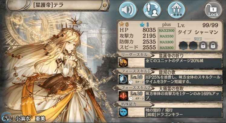 味方ユニットのサポートが可能なユニットです。銀河の歌で味方全体のスキルクールタイムをなんと3ターンも短縮可能なスキル!これだけでもかなり魅力的ですが味方の攻撃力を1ターンのみアップさせる効果も大ダメージを発生させられるので便利です。