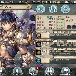 | Lv.1:光属性150%単体攻撃。高確率攻撃力30%ダウン、HPが60%以下なら威力が1.4倍。 Lv.7: