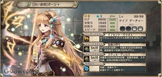 | Lv.10 HP25%を消費し、光属性の240%単体攻撃。超高確率で攻撃力50%ダウン |