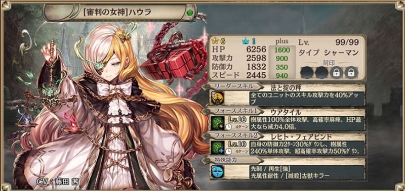 | 自身の防御力2ターン30%ダウンし、樹属性240%単体攻撃。超高確率攻撃力50%タダウン。 |