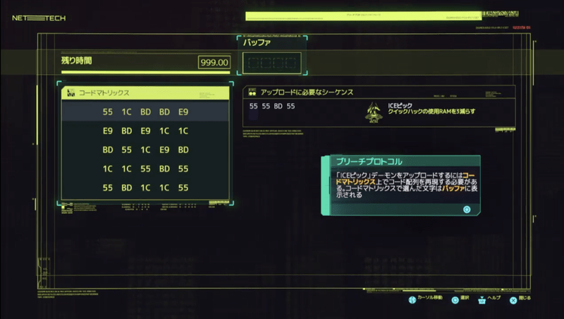 ハッキングのポップアップから「ブリーチプロトコル」を選択すると上記のようなコード配列を選択する画面が表示されます。