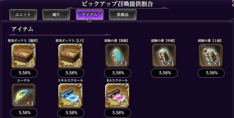 スキルスクロールとRAスクロールは同じ排出割合ですが、ガチャによって排出割合は違うので注意が必要です。