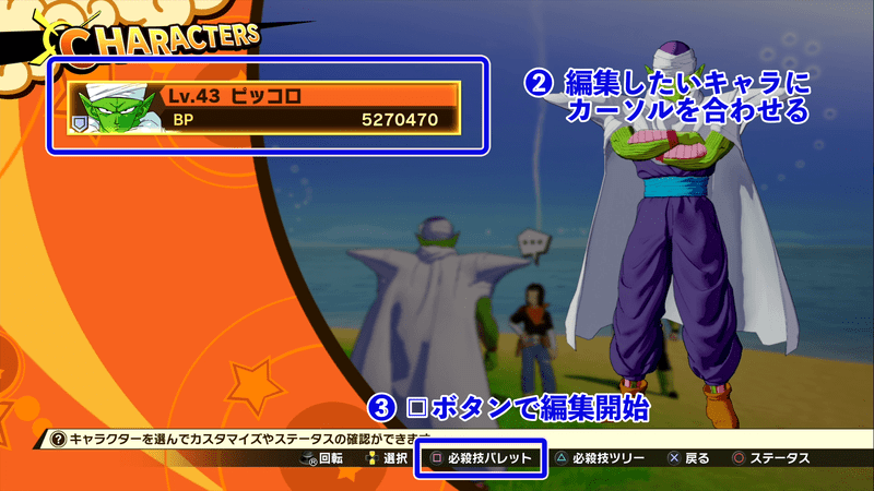「かめはめ波」などのビーム技やガードブレイクダメージの高い技をプレイヤーの好みで□or△ボタンに配置しておくとバトルで使用しやすいです。
