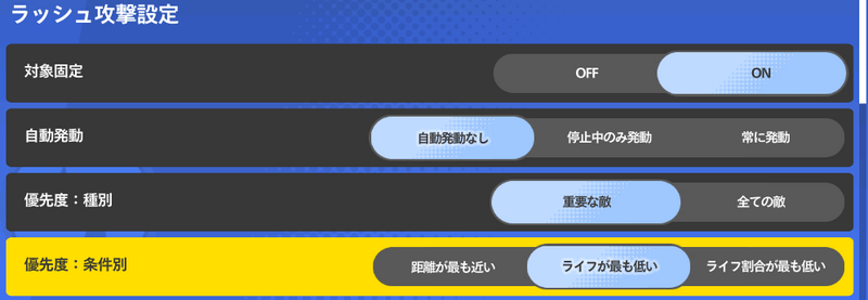 ラッシュ攻撃の優先度は「ライフ割合が低い」に設定しておきましょう。