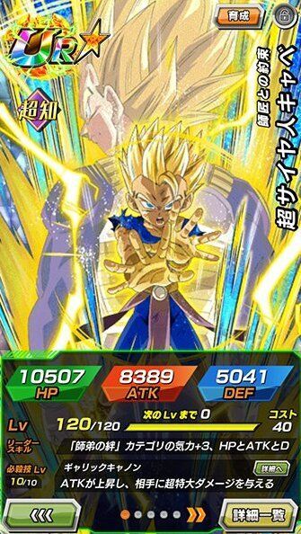 | パッシブ スキル | 自身のATKとDEF130%UP&チームの「宇宙サバイバル編」カテゴリの味方1体につきATKとDEF6%UP&「宇宙サバイバル編」カテゴリの味方全員の気力+3、ATKとDEF40%UP&名称に「ベジータ」(幼年期、Jr.等を除く)を含むキャラが攻撃参加中の味方にいるとき攻撃時に更にATK60%UP | ||