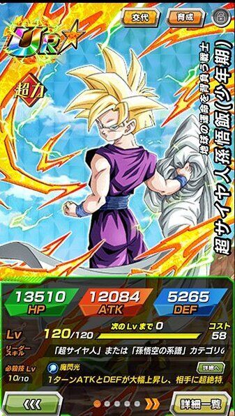 | リーダー スキル | 「超サイヤ人」または「孫悟空の系譜」カテゴリの気力+3、HPとATKとDEF170%UP 「人造人間/セル編」カテゴリを含む場合は更にATKとDEF30%UP | ||