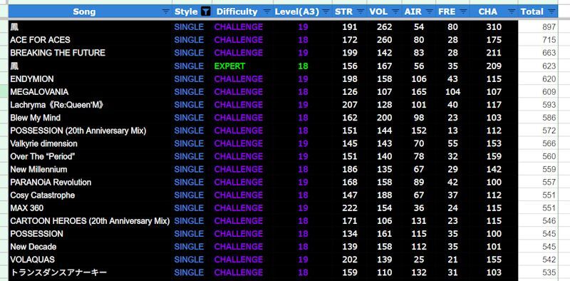 | Song_Chart | Level | Version | Notes | Freezes | Shocks | STR | VOL | AIR | FRE | CHA |