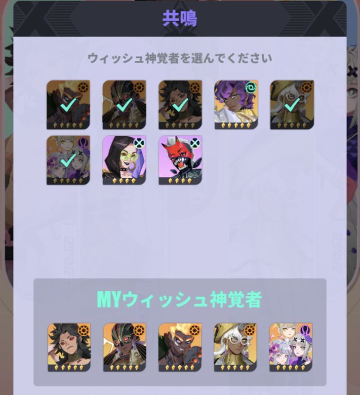 共鳴ガチャは、所持しているキャラを5体選んでランダムで1体獲得することがでる共鳴、凸狙いのガチャとなっています。