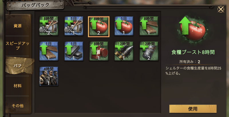 またバッグの中にアイテムとして収容されている資源パックや食糧・木材は「使用」することで獲得できます。