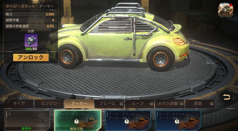 画面下部の装置部位を選択し、「改造パーツ」や「高性能パーツ」を使用しアンロックします。パーツはラピッド・リンクから入手できます。