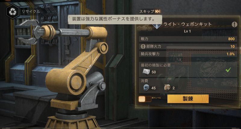 製造現場で木材や鋼材を消費し「プレミアム金属」などを製造することができます。獲得したプレミアム金属を使い、各部位「アーマー装置」「武器装置」「エンジン装置」「FCS装置」「APS装置」「動力装置」で製錬し、レベルアップさせることができます。