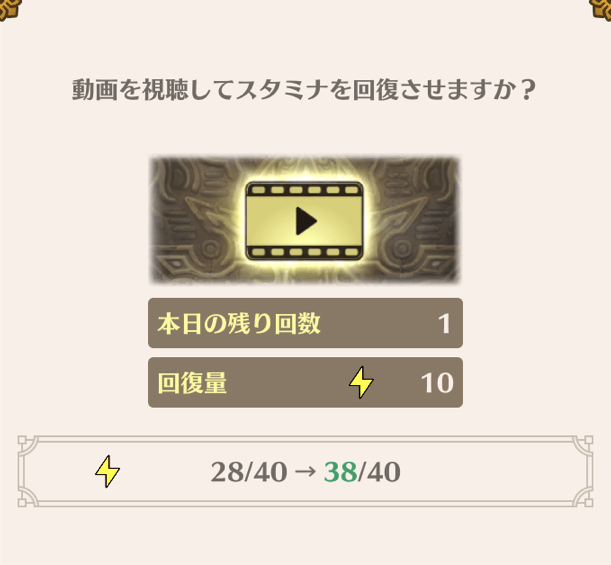 1日に2回まで広告の動画を視聴することで、1回につき10のスタミナを回復することができます。