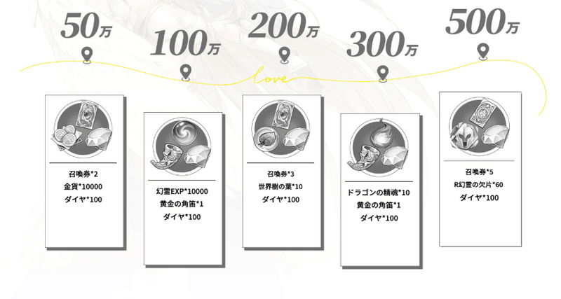 | 500万 | 召喚券×5 R幻霊の欠片×60 ダイヤ100 |