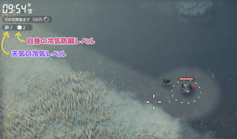 天気のレベルと自身の冷気防御のレベルは画面左上で確認できる。