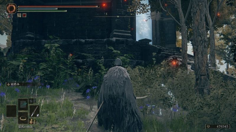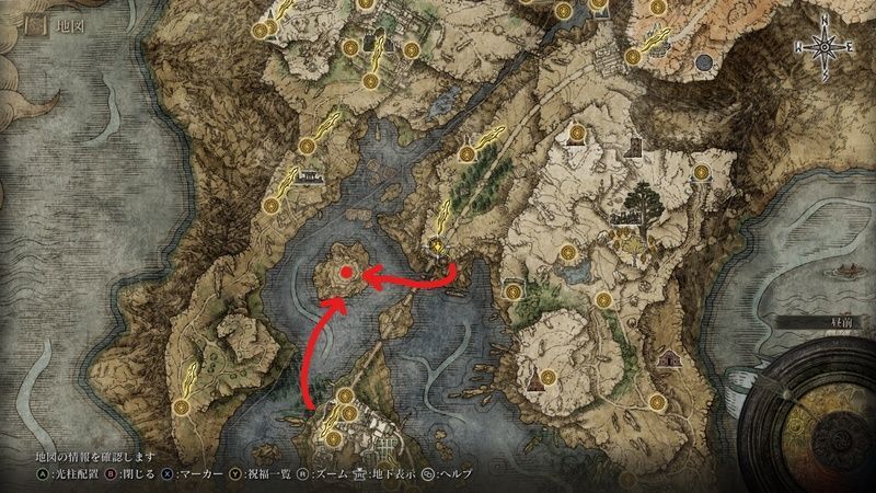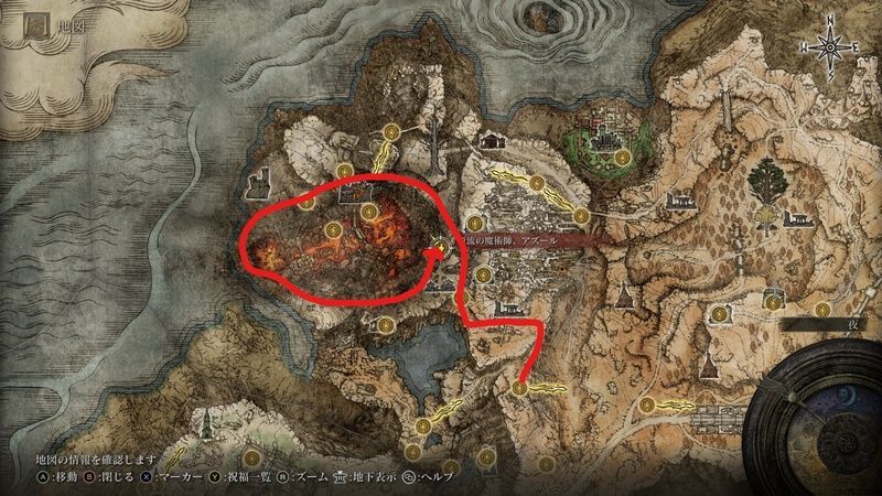 初めて向かう場合は、祝福「黄金樹を臨む丘」から北にあるウィンダムの廃墟からゲルミア火山に入り、地面からガスが出ている場所や、ライード砦前、隠者の村を抜けてぐるっと回る形で向かいましょう。