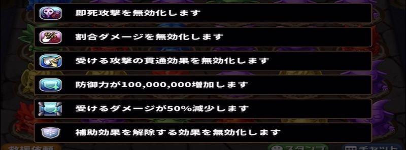 | 先制 | ・即死/割合/貫通効果を無効 ・補助効果を解除する効果を無効 ・防御力が100,000,000増加 ・被ダメージが50%減少 |