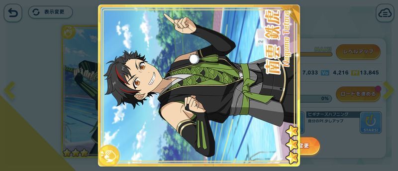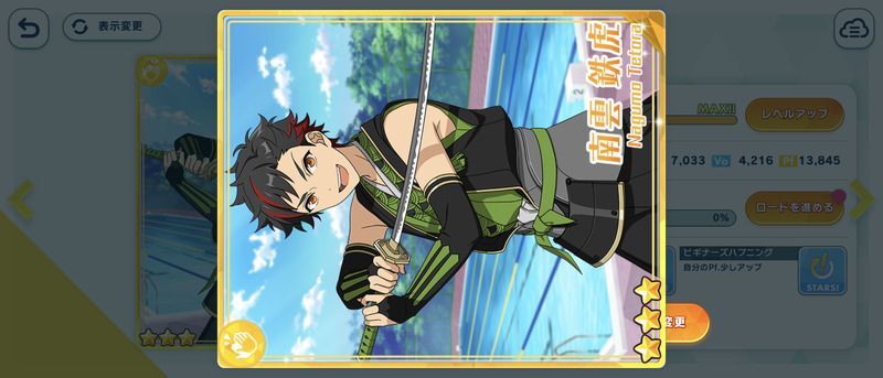 | 1枚(限界突破無し)状態のレベルMAX アイドルロード全開放 BREAK0段階(各能力値3,333加算なし) レインボーロード0% |