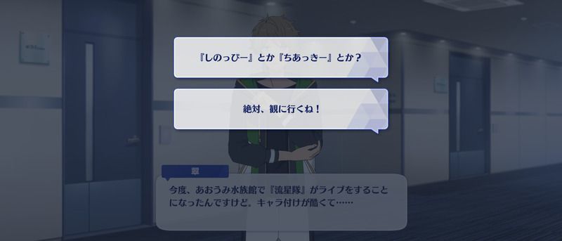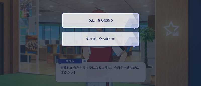 | 3 | あっ、『プロデューサー』さん! 入り口のところで何してるのォ? ほら、入って入って♪ | ||