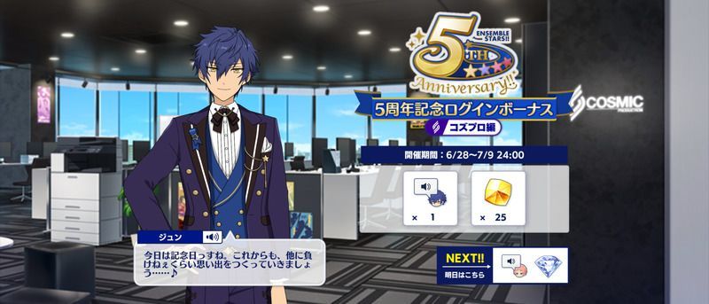期間中、日替わりでCOSMIC PRODUCTION(コズミックプロダクション)所属のアイドルたちの記念ボイスと、ダイヤや育成アイテムをGETできます!
