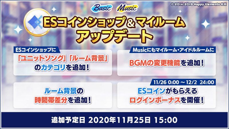 | 【開催期間】 2020年11月26日 0:00 〜 12月02日 23:59 ESコインショップへのアップデートを記念してESコインがもらえるログインボーナスを開催♪ |