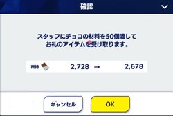 アイドルと教師全員にチョコを渡し終えるとチョコの材料を50個使用すると、スタッフにチョコを渡せます。