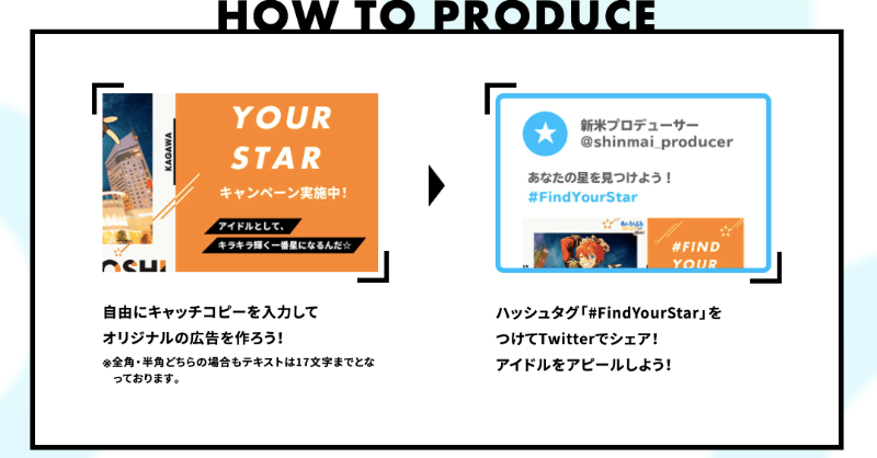 プロデューサーとして、選んだアイドルにキャッチコピーをつけてSNSで宣伝(シェア)できます!