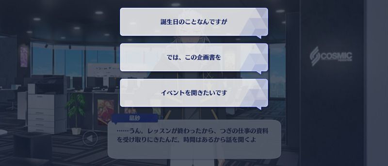 | 1 | ……うん。レッスンが終わったから、つぎの仕事の資料を受け取りにきたんだ。時間はあるから話を聞くよ | ||