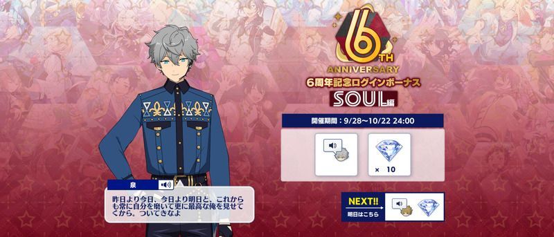 | 10月12日 | ボイス「六周年の挨拶(瀬名 泉)」 ダイヤ×10 |