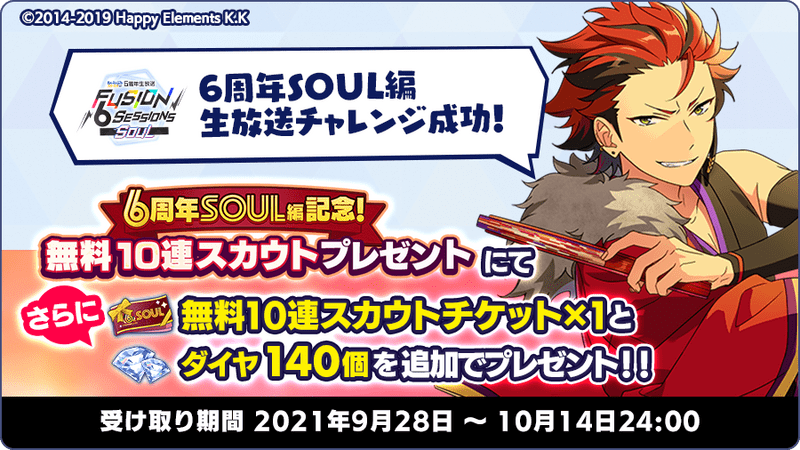 あんさんぶるスターズ!!6周年SOUL編記念生放送『FUSION 6SESSIONS SOUL』で実施した番組内チャレンジ成功をうけて、ダイヤ140個と「10連スカウトチケット」1枚を追加でプレゼント!